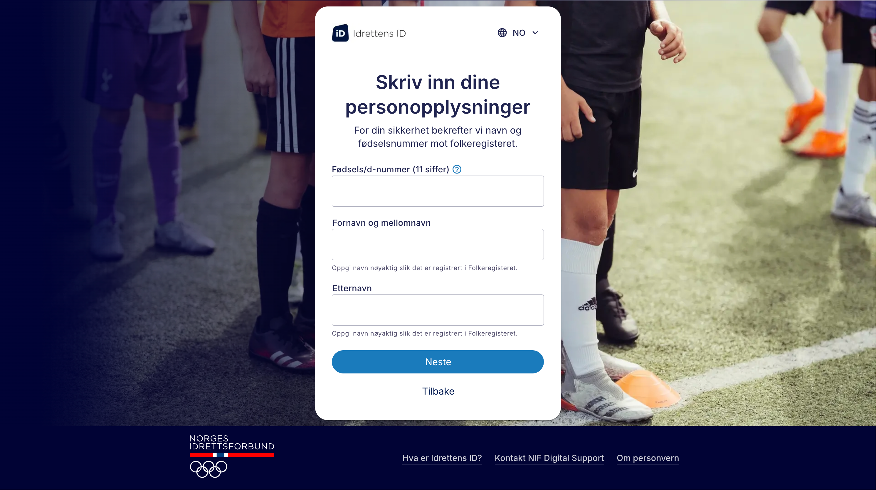 Du er nå i registreringsprosessen for å lage en bruker med Idrettens ID.