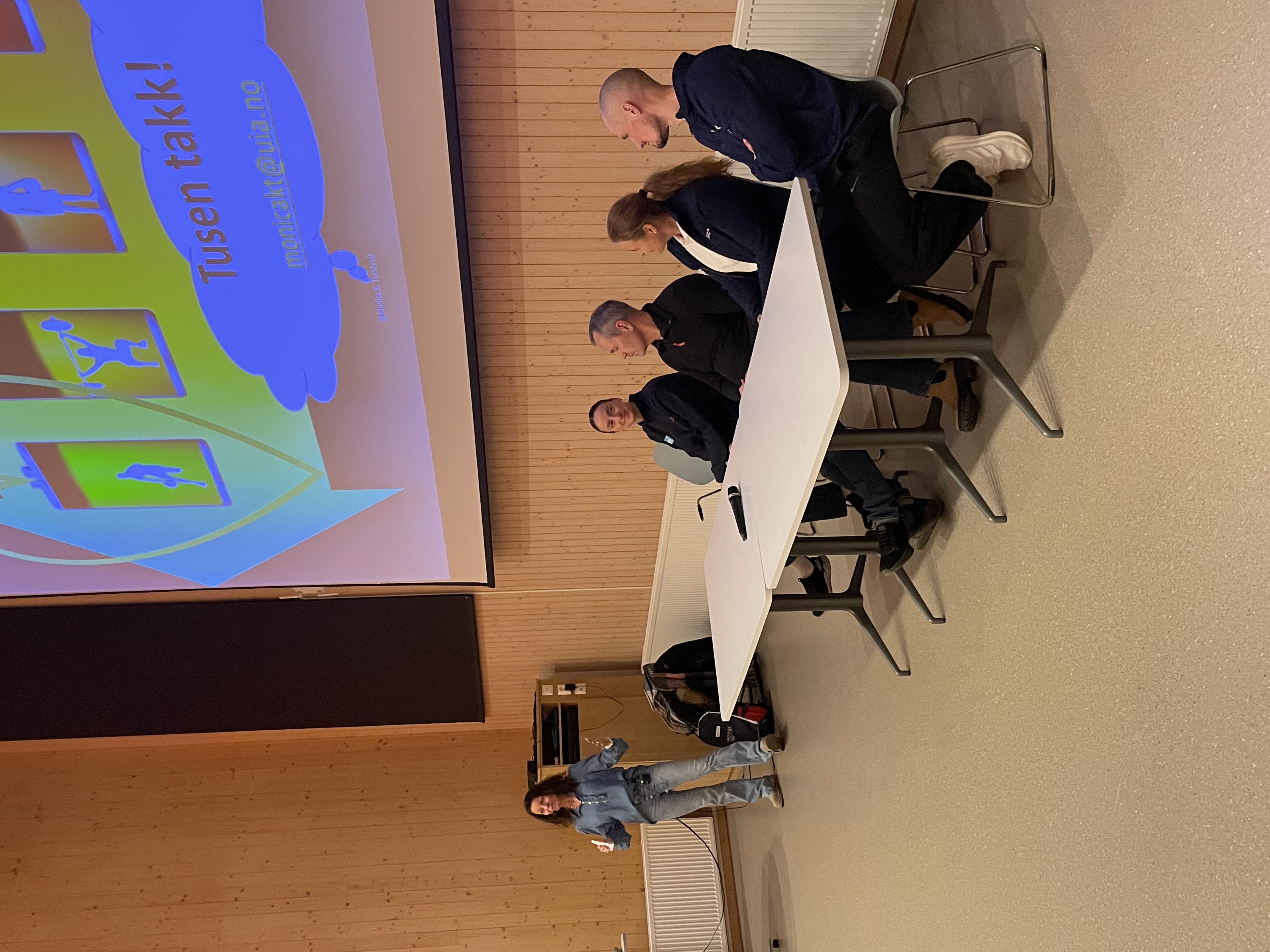 Etter Monicas innlegg fulgte en panelsamtale med fire personer med svært ulik bakgrunn og bred kompetanse. Her fikk deltakerne svar på sine spørsmål fra Anna Durendahl Sønslien, klinisk ernæringsfysiolog i Hustadvika kommune og foredragsholder for Sunn Idrett; Martin Kitel, trener i Moldekameratene Bokseklubb og sportssjef i Norges Bokseforbund; Elin Kortner Lystad, fysioterapeut og idrettsfysioterapeut ved Molde Idrettsklinikk; samt Stian Drogseth, lærer ved idrettsfag på Romsdal videregående skole og trener i flere idrettslag i Molde, blant annet Molde Basket, Molde FK Kvinner og Sportsklubben Træff.