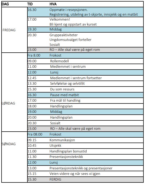 Kursbevis krever 100 % oppmøte. Alle deltakere skal være på egne rom senest klokken 23. Kurset er rus- og alkoholfritt.