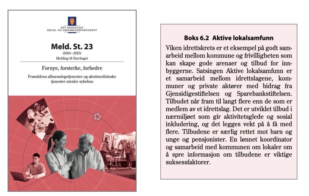 Viken idrettskrets' arbeid med Aktive lokalsamfunn og aktivitet for eldre ble omtalt i Stortingsmelding 23 Fornye, forsterke, forbedre.
